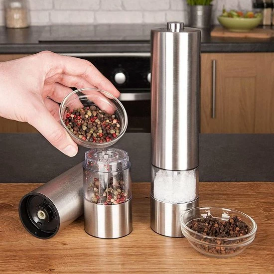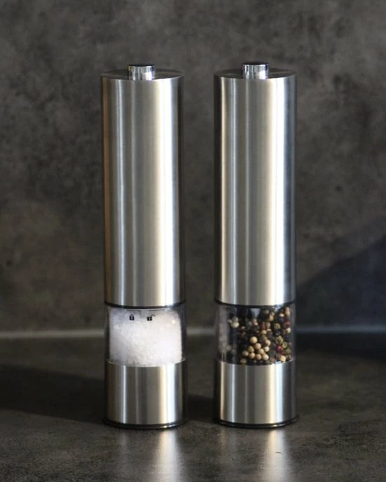 Het peper en zoutstel is voorzien van ledverlichting aan de onderkant. Door middel van de ledverlichting kan je gemakkelijk zien hoeveel kruiden je op je maaltijd hebt gestrooid. De elektrische molens worden ondersteund door 4 AA batterijen, deze kun je gemakkelijk bevestigen door de behuizing los te draaien.