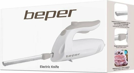 - Elektrisch mes met ABS body en zelfslijpende roestvrijstalen messen van 17 cm. Voorzien van een knop om de messen uit te werpen en een dubbel veiligheidssysteem. Ergonomische handgreep voor gemakkelijke grip.
