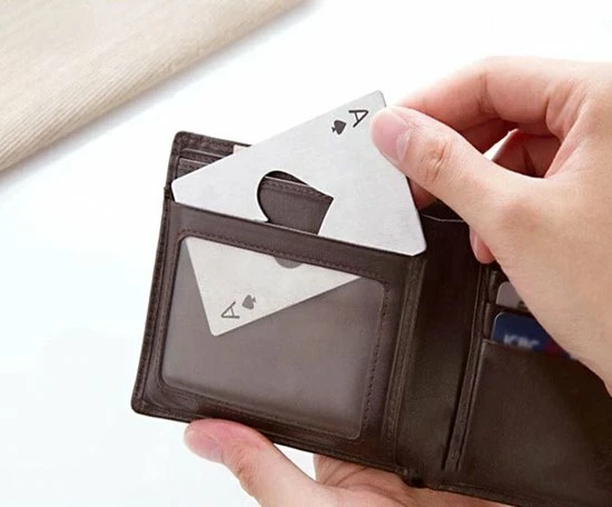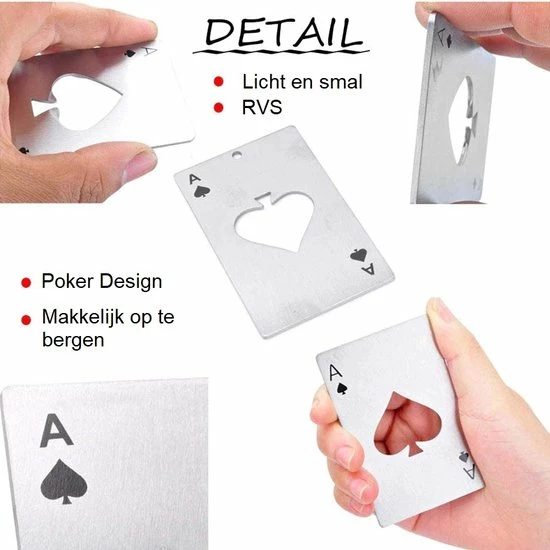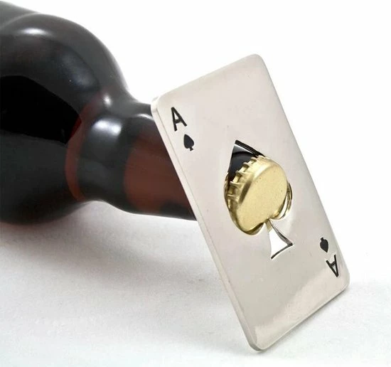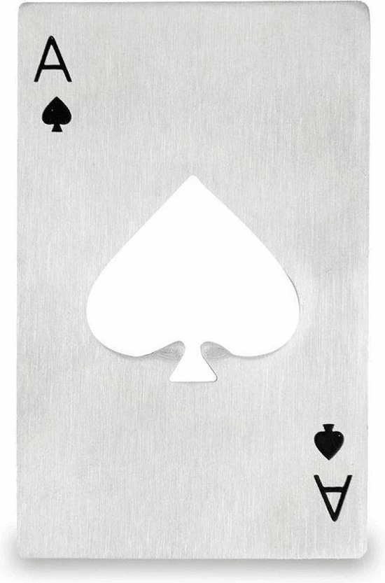 Speel je graag een kaartspelletje met je vrienden? Dan moet je een extra kaart naast je hebben liggen, namelijk deze Schoppen aas flesopener. De bier & fles opener ziet eruit als een schoppen aas speelkaart van rvs. Met deze flesopener heb je zó dat koude biertje open gemaakt. Wel zo gezellig tijdens een spannend kaartspelletje met je vrienden. Doordat de stalen flesopener hetzelfde formaat als een creditcard heeft, neem je ‘m makkelijk met je mee in je broekzak of portemonnee. Zo kom je nooit zonder bier & fles opener te staan.