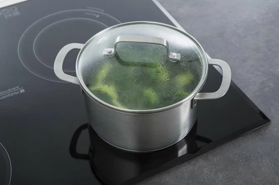 De gesatineerde roestvrij edelstalen body loopt loodrecht omhoog en mondt uit in een strakke rand. Door deze schenkrand kun je eenvoudig vloeistoffen afgieten. De strak afgeronde grepen en stelen zijn vuurvast, liggen prettig in de hand en zorgen voor een veilige grip tijdens het koken.