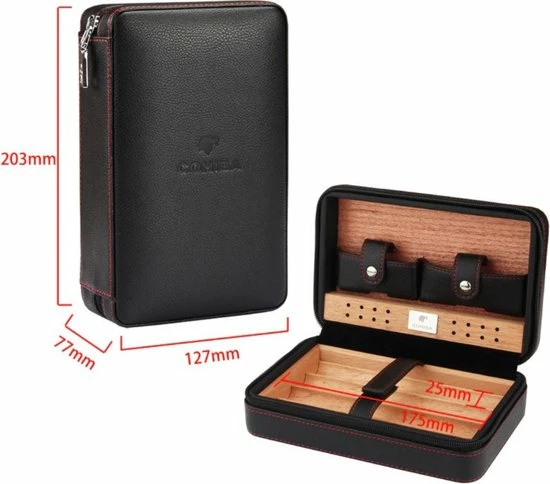 Het luxe ontwerp gemaakt van cederhout en leer zorgt voor een zeer hoge kwaliteit sigarendoos. De Cohiba sigarendoos biedt ruimte voor een aansteker en een sigarenknipper. Het kleine, maar luxe formaat zorgt ervoor dat de sigarendoos ideaal is om mee te nemen op reis. Cohiba is al lange tijd actief in de sigarenindustrie dus weten zij precies waar een kwalitatief goede sigarendoos aan moet voldoen!