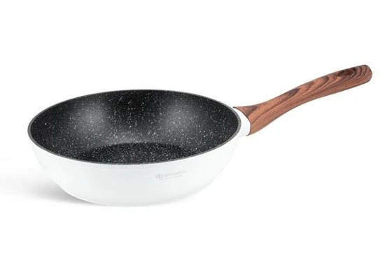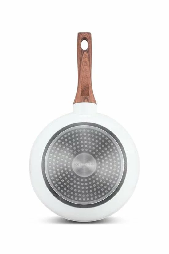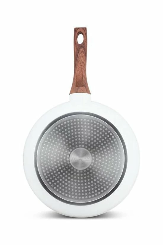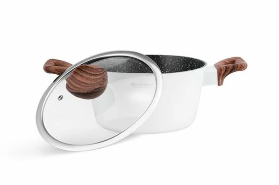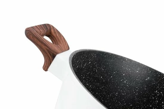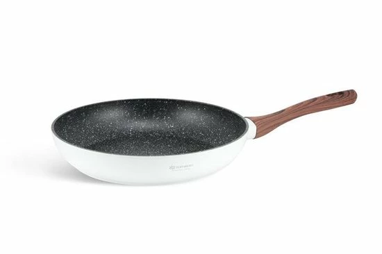 - Gegoten aluminium, met keramische/marmeren coating, ideaal voor aanbraden, en vetarm koken