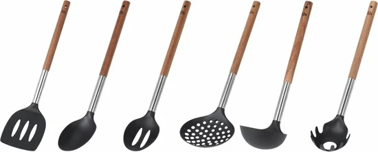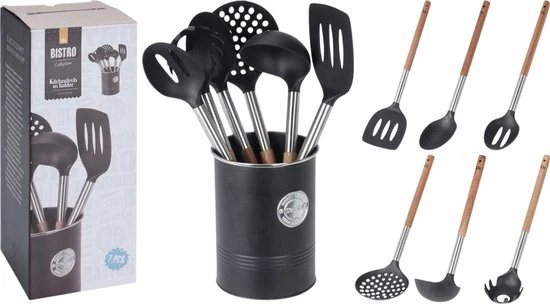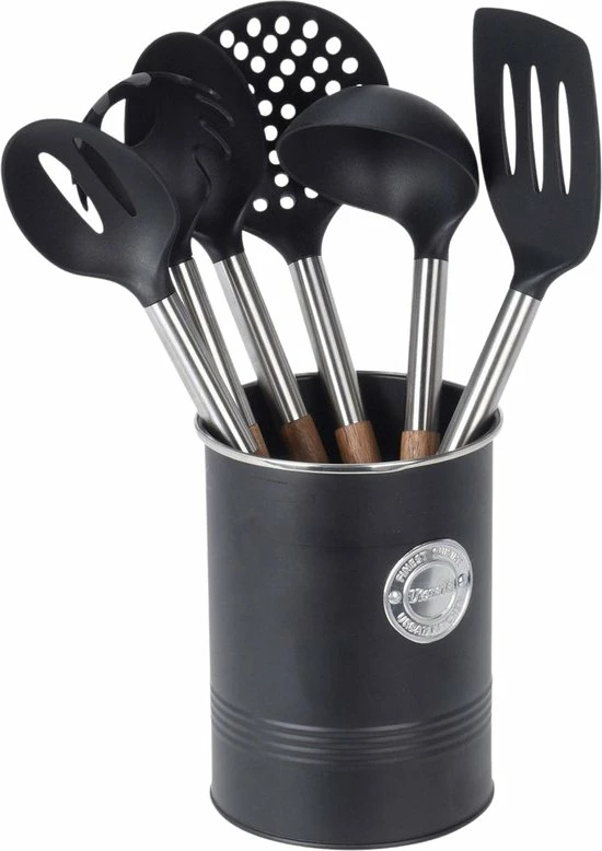 Zoek jij wel eens alle kastjes en laden af naar de juiste spatel of soeplepel? Dat kan veel makkelijker! Ontdek wat zorgeloos koken is met de Valetti 7-delige keukengerei set. Deze set heeft alles wat je nodig hebt en in de handige houder ligt alles binnen handbereik en kook jij stressvrij jouw favoriete gerechten. Deze set kun je direct gebruiken om te mixen, roeren en bakken. Ieder stuk van deze kookgerei set heeft ophangogen zodat je deze gemakkelijk kunt ophangen.