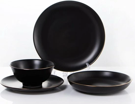 Eet samen met je gezin en gasten in stijl met deze bijzonder en uniek 6 persoons serviesset. Een prachtige complete set glanzend en volledig zwart met gouden randen. Zwart goud servies straalt luxe uit en past in veel interieurs.