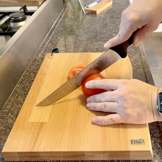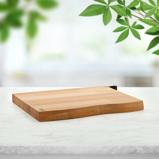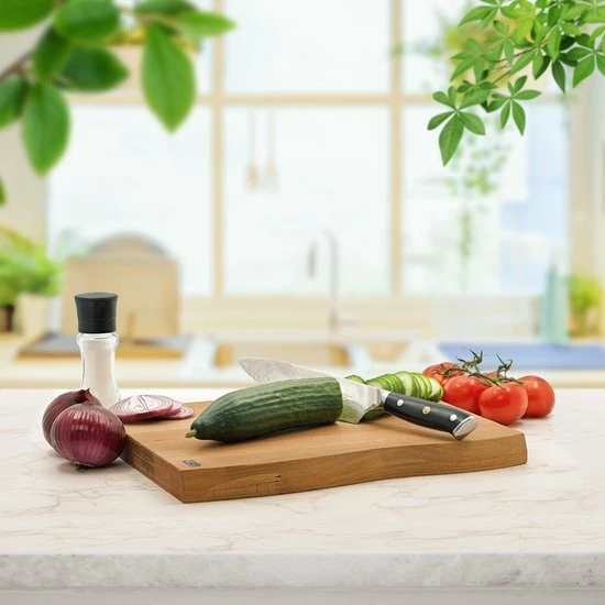 Deze robuuste en stevige snijplank heeft een afmeting van 37 x 29 cm en een dikte van maar liefst 3 cm. De golvende afwerking aan de zijkant geeft dit hakblok een stijlvolle uitstraling. Behandel de plank eens per 2 tot 4 maanden met olie om de levensduur te verlengen. Ook toe aan een stukje luxe in je keuken of op zoek naar een perfect cadeau voor die ene chef in je leven? Bestel dan deze stijlvolle snijplank vandaag nog.