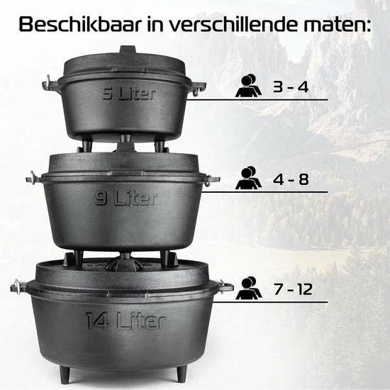 Maak van koken een beleving met de traditionele Dutch Oven van IRONO. Met de multifunctionele gietijzeren pan kun je alle kanten op. Zo behoren koken, braden, stoven, frituren, stomen en bakken allemaal tot de mogelijkheden. Met een gecombineerde inhoud van 14 liter maak jij een lekkere maaltijd voor 7 – 12 personen.