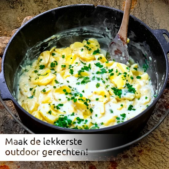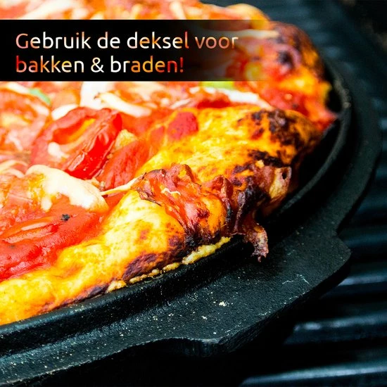 De gietijzeren pan kan direct in of op de warmtebron geplaats worden. Dat maak dit type pan uitermate geschikt maakt als BBQ pan. Ook koken op een kampvuur of gasfornuis behoord tot mogelijk. Door de hoge massa aangietijzer reguleert een Dutch Oven de ongelijkmatige hitte en verdeeld deze over de gehele pan. Hierdoor is het mogelijk om gerechten gelijkmatig te garen. Ook onze deksel is geschikt om in te bakken of braden. Door de pootjes kun je de deksel stabiel neerzetten en als koekenpan gebruiken.