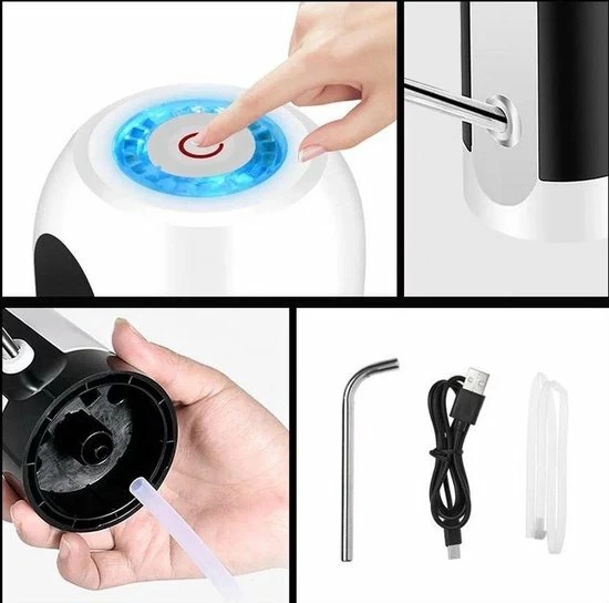 De ideale oplossing om het water uit groter waterflessen te krijgen! Plug & play. Makkelijk aan te sluiten en op te laden. Met één druk op de knop wordt het water uit de fles gepompt zoals te zien op de foto’s.