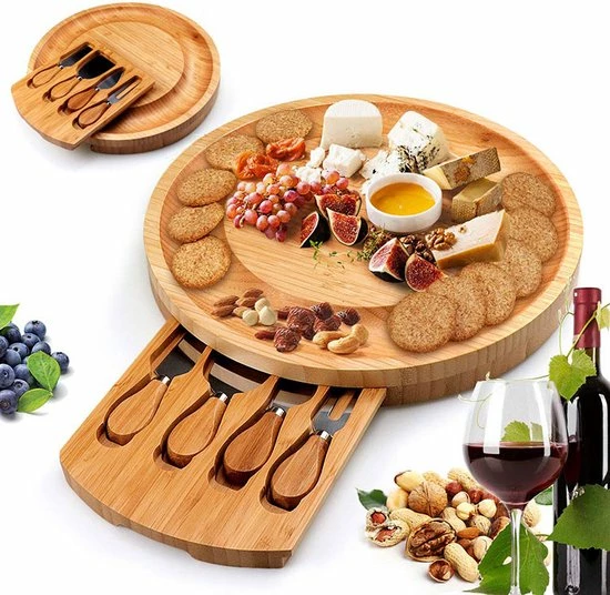 De tapasplank is een chique ronde plank die beschikt over een uitschuifbare lade. Deze lade is gevuld met 4 chique en professionele mesjes. Deze mesjes zijn erg geschikt voor het snijden van kaasjes (en andere hapjes). De mesjes zijn gemaakt van roestvrijstaal en zullen dus lang mooi blijven.