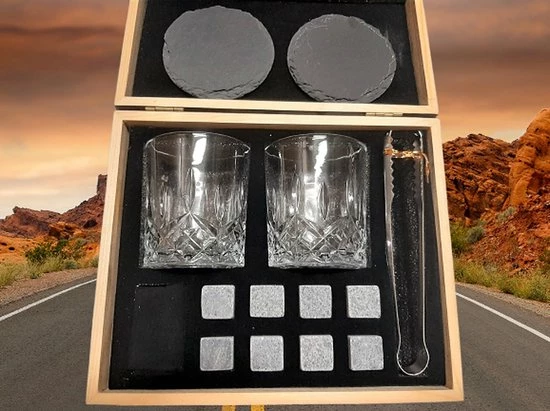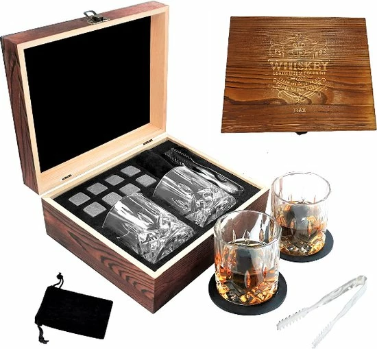 • Inhoud: Luxe doos, 2 whiskey glazen, 8 whiskey stenen, 2 onderzetters, 1 knijptang en handig opbergzakje.
