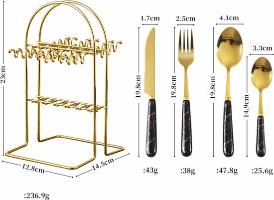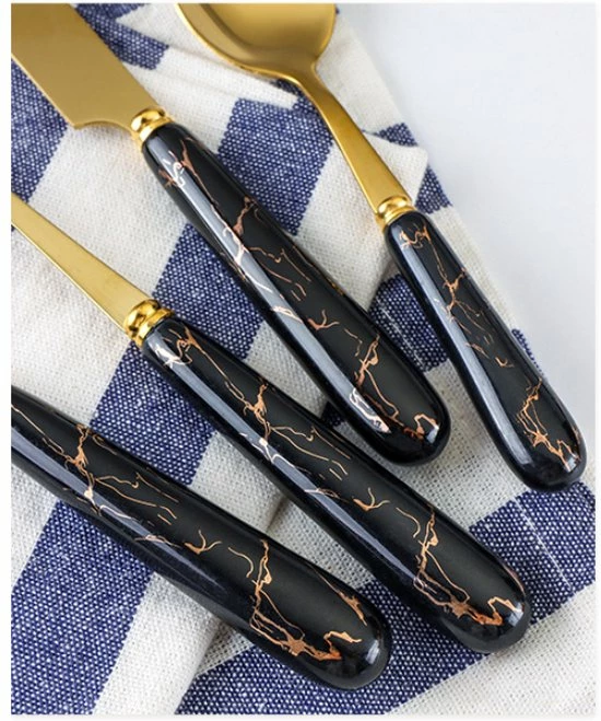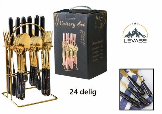 Wil jij ook hoge ogen gooien met een stijlvol gedekte tafel? Hip, helemaal van deze tijd met een chique uitstraling. Met deze 24-Delig keramische goud met zwart kleuren Bestekset maak je van ieder tafelmoment een feestje. Van voorgerecht tot dessert: de Levabe bestekset is geschikt voor 6personen en bestaat uit: