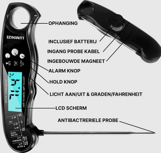 Ben jij opzoek naar een vleesthermometer die niet alleen snel en accuraat meet, maar ook nog eens over alle functies beschikt. Bestel dan nu de Luminize BBQ vleesthermometer!
