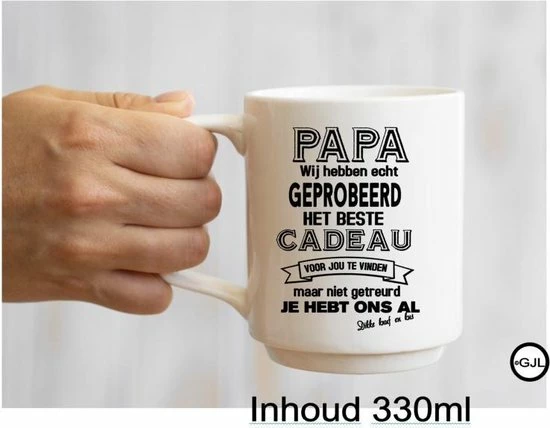 Super leuke bedrukte beker met een tekst Papa wij hebben echt geprobeerd om het beste cadeau voor jou te vinden maar jij hebt ons al incl een bijpassende onderzetter