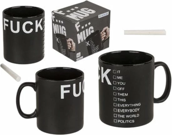 – Met deze Fuck mok kun je zelf invullen wat er Fuck is, je hebt namelijk verschillende vakjes die je met je krijtje kunt aanvinken. Je collega’s of je gezinsleden kunnen zo precies zien wat er precies dwars zit.