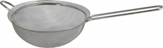 RVS keuken vergieten/zeef met handvat 20 cm. Deze RVS zeef met draaggreep heeft een formaat van ca. 20 cm in diameter en daarmee ideaal om te gebruiken boven een pan of beslagkom. Lengte: ca. 37 cm. Materiaal: RVS (metaal). Keuken/koken benodigdheden zeven/vergieten van metaal.