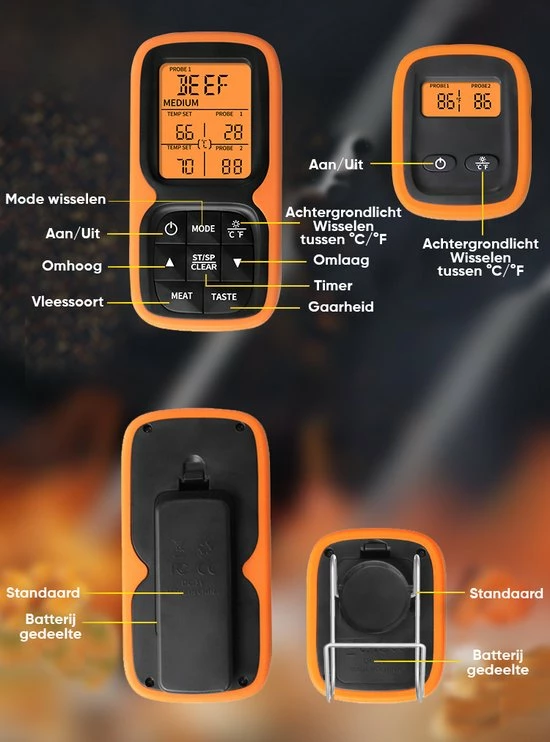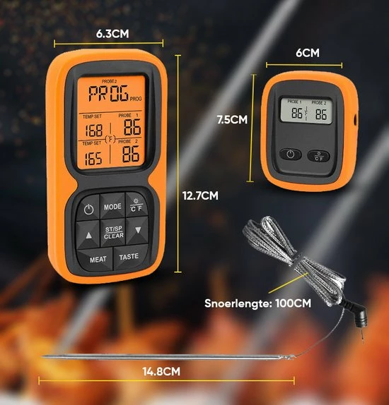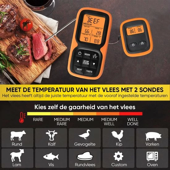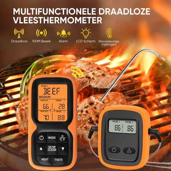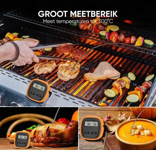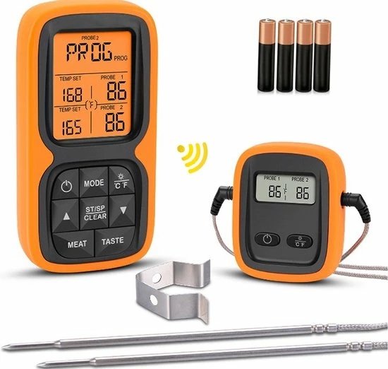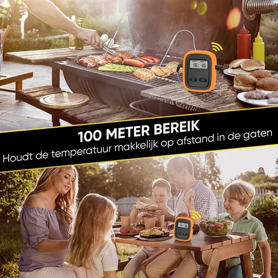 Doordat de thermometer een bereik van 100 meter heeft hoef je niet de hele tijd in de buurt te blijven en kan je de temperatuur op afstand in de gaten houden. Daarnaast wordt de thermometer geleverd inclusief 2 roestvrij stalen sondes zodat je de temperatuur van het vlees zo accuraat mogelijk kan meten. Je hoeft je verder geen zorgen te maken of de sonde de hitte wel aan kan, want de sonde kan temperaturen tot 380°C aan en het snoer zelf maar liefst temperaturen tot 500°C.