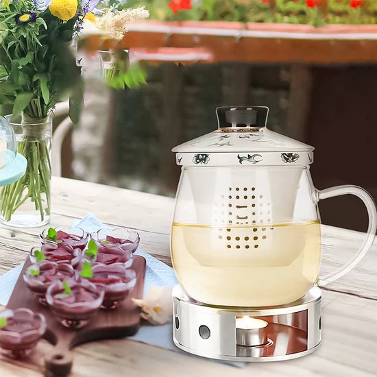 - Eenvoudig in gebruik – steek gewoon de theelichtkaars in het midden van de glazen verwarmer aan en plaats de theepot erop en geniet van warm gezette thee. De warmer houdt de thee urenlang warm.