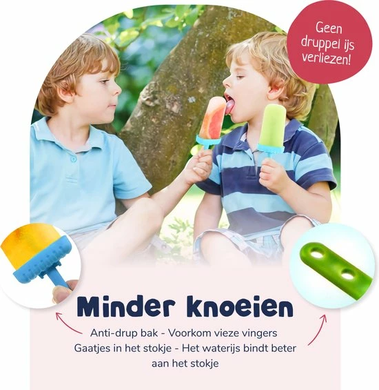 - Geen geknoei en gestuntel – De sluiting van de ijslolly vorm heeft een ingebouwde anti-drup bak waardoor vieze vingers wordt voorkomen. Kleine gaatjes in het stokje laten het ijs beter aan het stokje binden; dus geen druppel verloren ijs op de grond!!