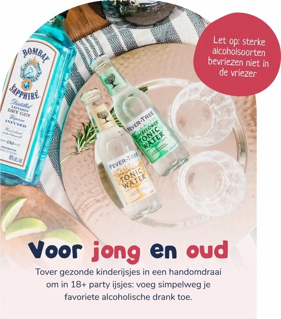 - Voor jong en oud – De ijslolly vormen zijn zeer geschikt voor het maken van kinderijs. Maar daar hoeft de pret niet op te houden: probeer eens een ijslolly met alcoholische dranken voor de perfecte 18+ snack! Let wel op dat het alcoholpercentage niet te hoog is, ander bevriest het niet in de vriezer.