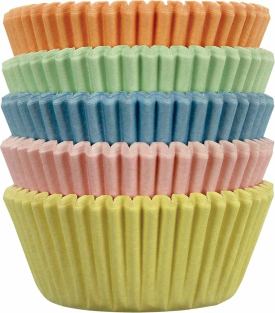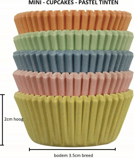 Kleine papieren mini cupcake vormpjes in 5 x 20 Pastel kleuren. Geschikt voor gebruik in over in combinatie met een mini muffin bakvorm. Set van 100 stuks.