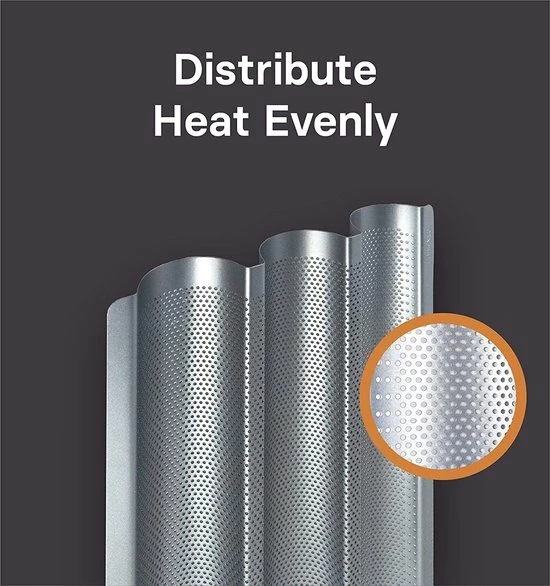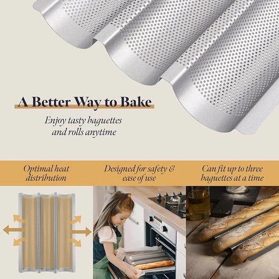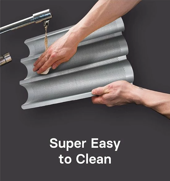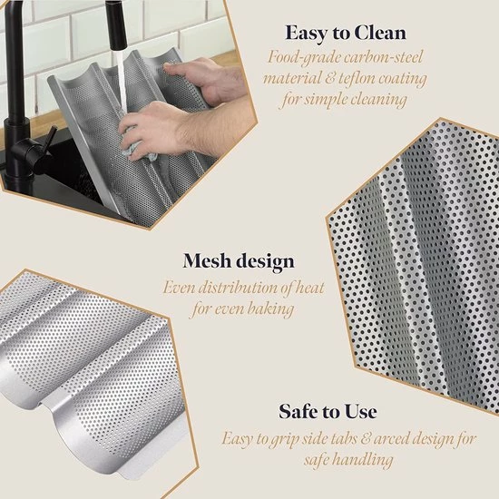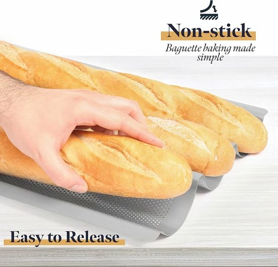• Makkelijk – De bagette houder heeft geen bakpapier nodig. Met deze speciale bakplaat slaag je er in de eerste poging in om je gebakken goederen te bakken, zonder te plakken en met een gemakkelijke reiniging achteraf