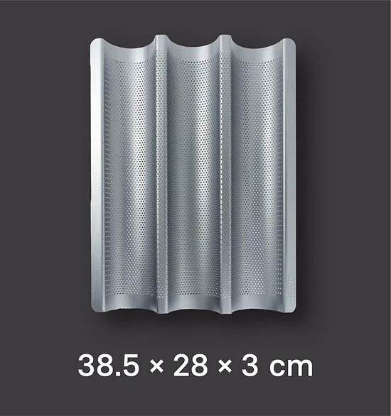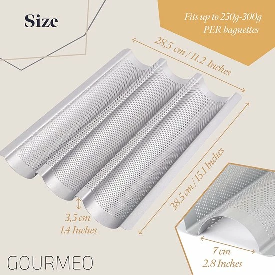 • Perfect formaat – Er kunnen maximaal drie baguettes worden gebakken in de GOURMEO stokbrood pan. Het stokbroodplateau heeft een afmeting van 38.5 x 28.5 x 3.5 cm. Zo past hij perfect in elke standaard oven