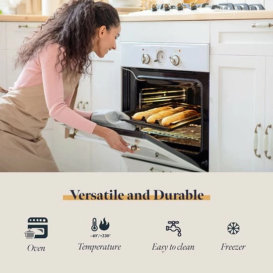 • Vaatwasmachinebestendig – Onze stokbroodbak om te bakken is resistent en vaatwasmachinebestendig, maar als je de levensduur wilt verlengen, raden we aan deze schoon te maken met een vochtige doek en een beetje afwasmiddel