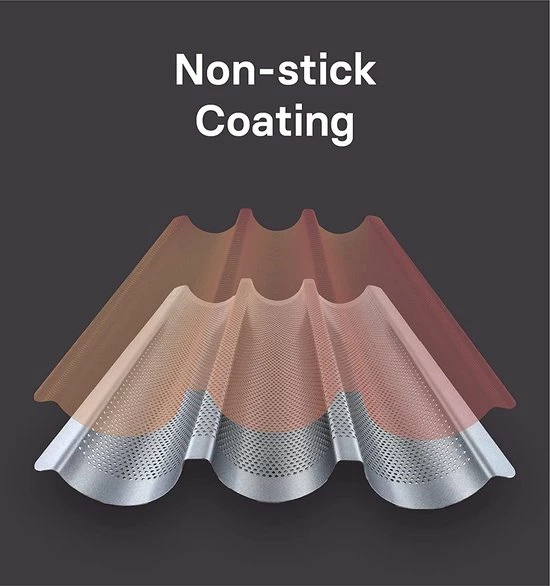 • Antiaanbaklaag voor stokbrood – De GOURMEO-broodbak is gemaakt van aluminium van voedingskwaliteit met een antiaanbaklaag die bestand is tegen hoge temperaturen. De gaten in het oppervlak laten het vocht ontsnappen, waardoor de broden gelijkmatig krokant en bruin worden