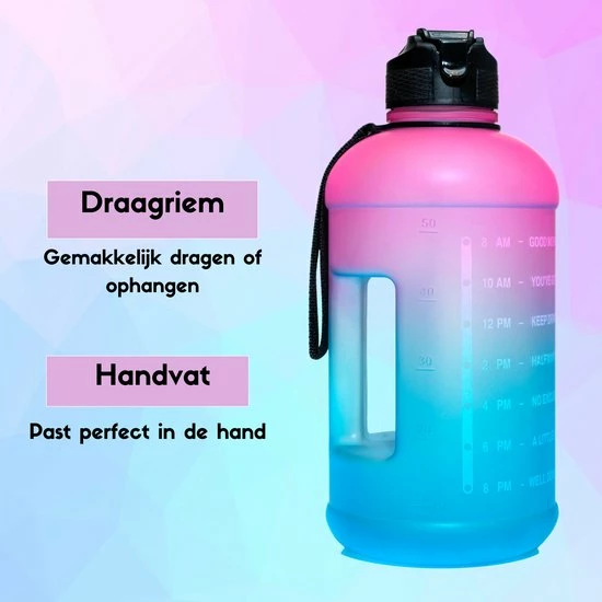 3 keer per dag je fles vullen? Dat is verleden tijd met de Quality Needz drinkfles van 2,2 liter. Met de Quality Needz waterfles weet je zeker dat je dagelijks goed gehydrateerd door het leven gaat. De fles heeft naast een geïntegreerde band, ook een handig en stevig handvat! De fles heeft een stevige klikdop inclusief drinktuit met rietje, die uiteraard lekvrij is. Heb jij moeite om de dagelijkse hoeveelheid water binnen te krijgen? Dan kunnen de tijdmarkeringen en motiverende teksten helpen!