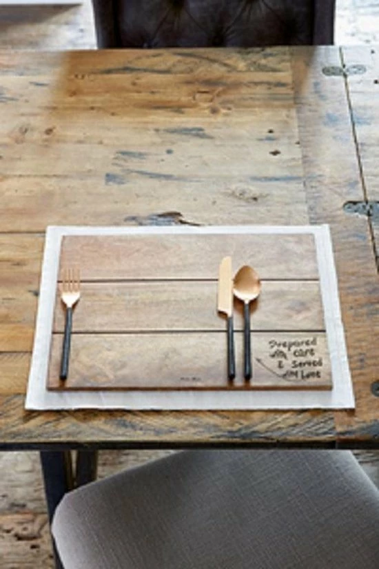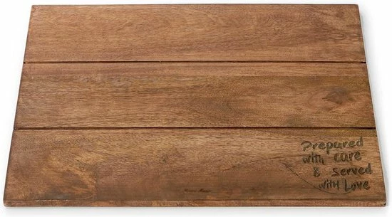 Geef de tafelsetting meer body met een mooie placemat. Zoals dit mangohouten exemplaar met daarin de tekst ‘Prepared with care & served with love’ gegraveerd. Stijlvol en praktisch.