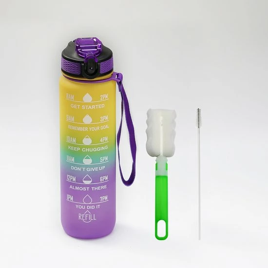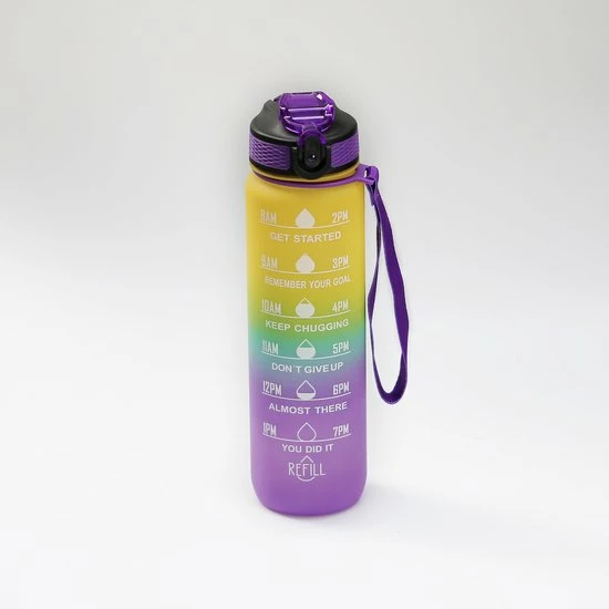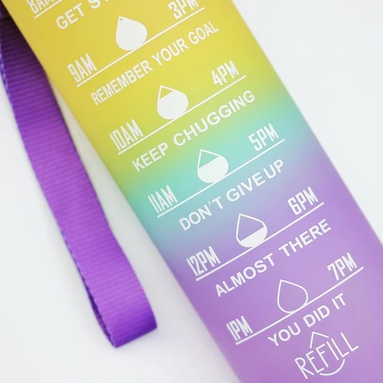 - Drinkfles met tijdmarkeringen: de vochttoevoer is een eenvoudige truc die je helpt om gezond te blijven. Deze waterfles met een inspirerend citaat en tijdstempel herinnert je er altijd aan om de juiste hoeveelheid water te consumeren, om de hele dag door gehydrateerd te blijven.
