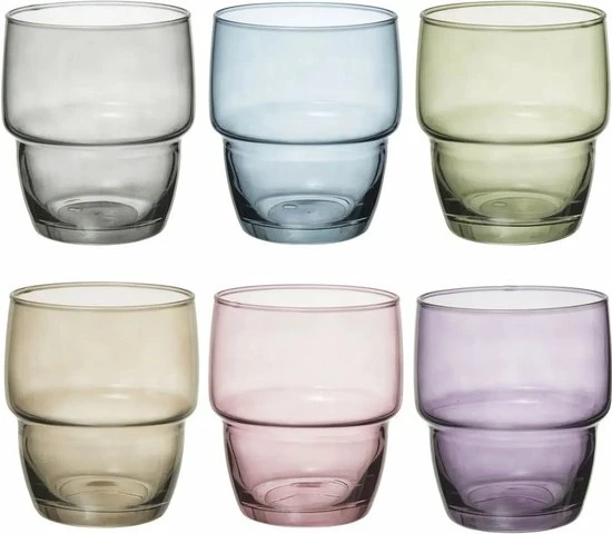 Set van 6x stuks stapelbare water glazen 280 ml. 6 Verschillende kleuren in een verpakking. Afmeting: ca. D7,5 x 9 cm, diameter onderkant ca. 6,5 cm. Inhoud: ca. 280 ml/28 cl. Gewicht per glas: ca. 150 gram. Materiaal: glas. Reinigen: vaatwasser geschikt. Serie: Rodrig.
