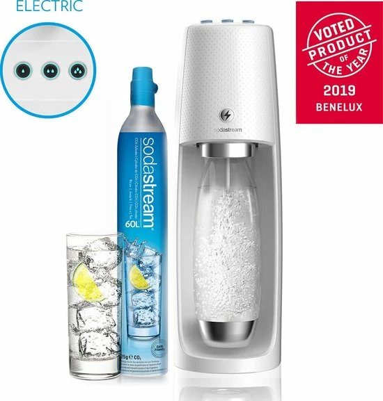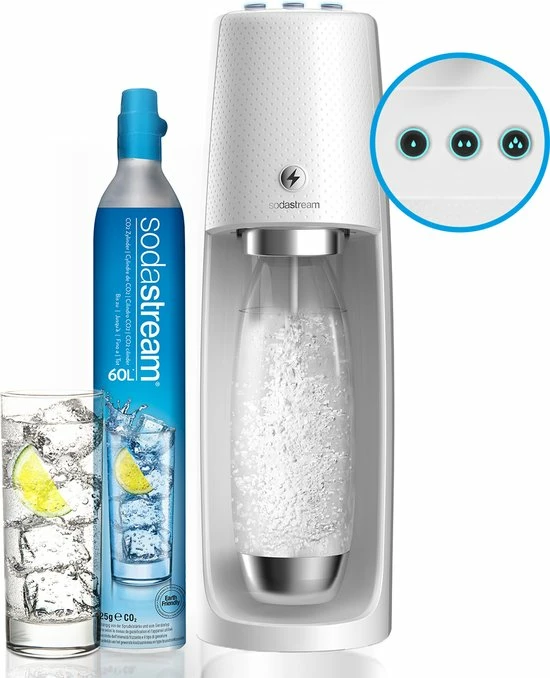 | Aanvullende functies | Dit, elektrische, toestel, onderscheid, zich, van, de, SodaStream, Spirit, doordat, de, bruisniveaus, zijn, voorgeprogrammeerd., Dit, product, scoort, daardoor, nog, hoger, op, gebruiksgemak., Je, hebt, namelijk, altijd, je, gewenste, bruisniveau. |