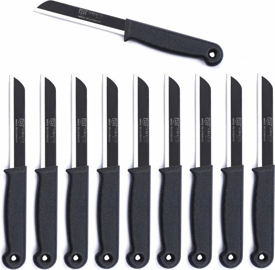 Onze specialiteit! Een wat groter mes dan onze schilmessen, deze kartelmes met een extra lang lemmet en scherpe kartels om de taaie huid van tomaten en paprika’s door te snijden, maar zeker ook geschikt voor zacht fruit. Deze tomatenmesjes / kartelmes hebben een kunststof handvat en een roestvrij stalen blad met fijne kartels.