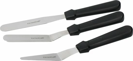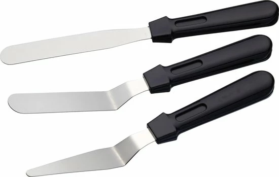 Een set van 3 paletmessen van het merk Sweet Choice. Ideaal voor het verspreiden een aanbrengen van bijvoorbeeld botercreme of icing op je taart, cake of gebak. De set bevat drie verschillende glaceermessen: