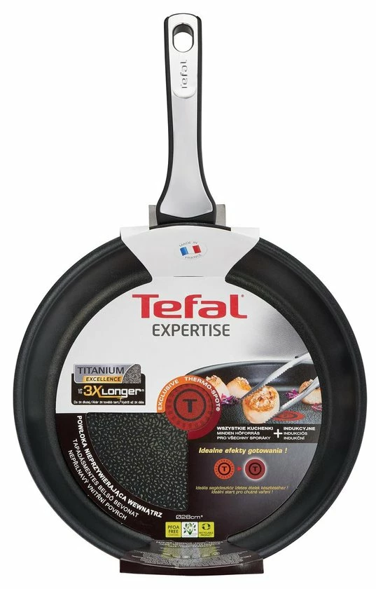 Deze luxe Tefal koekenpan uit de nieuwe pannenserie Expertise is voorzien van de nieuwste Tefal anti-aanbaklaag Titanium Excellence. De extra dikke anti-aanbaklaag is van een zeer hoge kwaliteit en 100% veilig (vrij van PFOA). Hierdoor is het de sterkste en meest duurzame anti-aanbaklaag van Tefal. Tijdens het bakken heb je geen boter of olie meer nodig en zelfs het gebruik van metalen spatels is geen enkel probleem.