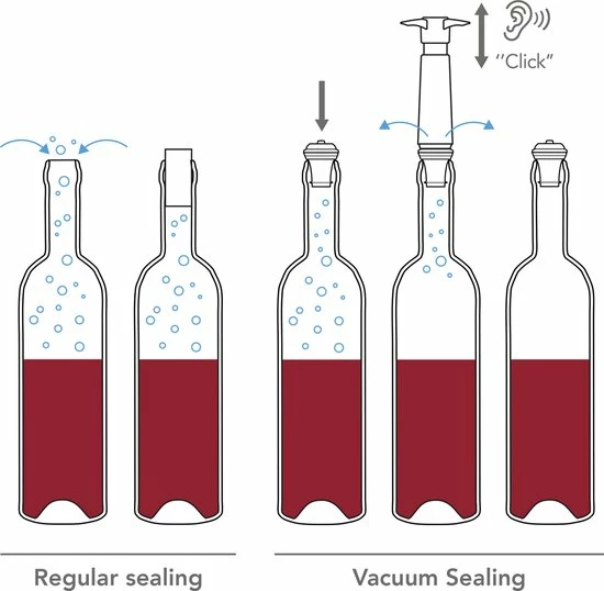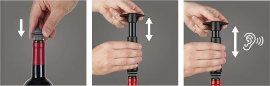 De vacuvin wijnstoppers worden gebruikt in combinatie met de vacucin wine saver die apart wordt verkocht. De vacuüm wine saver is een vacuümpompje waarmee lucht uit een open fles wordt gepompt waardoor deze opnieuw wordt afgesloten met een herbruikbare rubber vacuüm wijnstopper. Plaats de afsluitdop op de flessenhals en verwijder de lucht met behulp van een vacuümpomp. Het oxidatieproces van de wijn wordt vertraagd door de vacuüm, waardoor u op een later tijdstip opnieuw van uw wijn kun genieten.