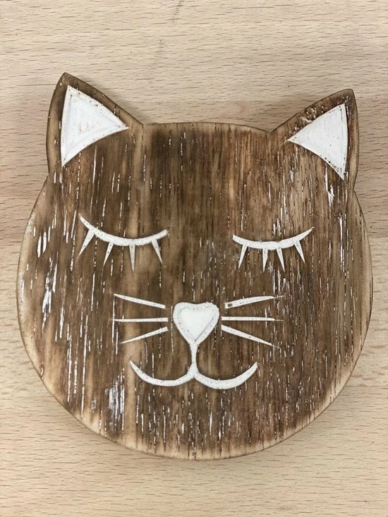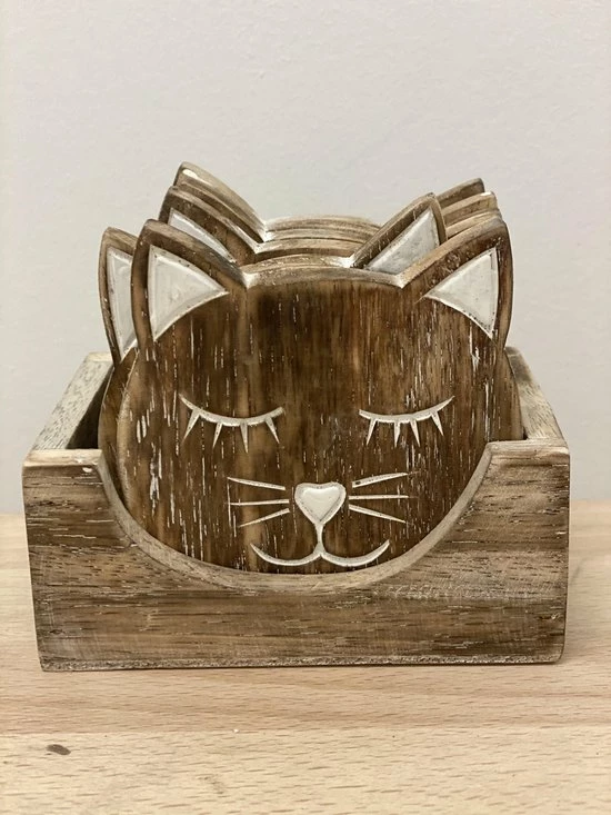 Super leuke houten onderzetters in de vorm van een kattenhoofd.